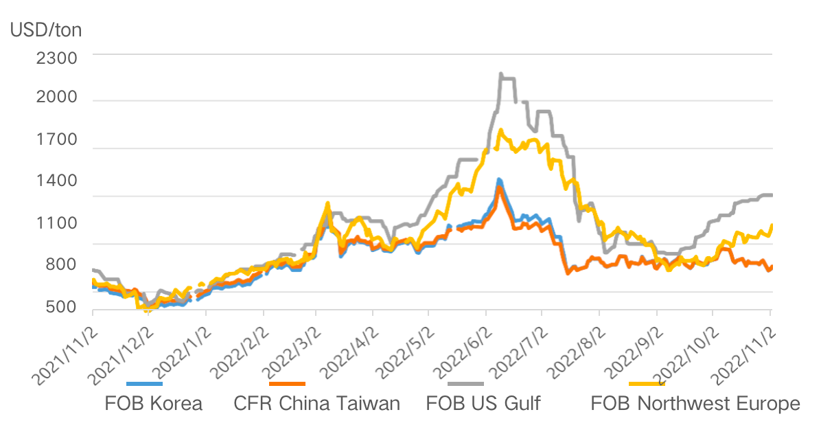 테이블 2. 아시아, 미주, 유럽의 이성질화 크실렌 가격과 연휴 전 가격 비교